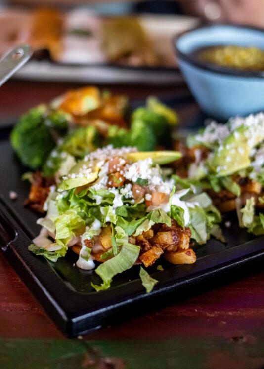 We love the Mis Garnachas: Sweet potato patties smothered with refried beans and a spicy chorizo hash and topped with lettuce, pico de gallo, mexican cream, queso fresco and avocado. It’s one of Harrison’s favorite dishes in Raleigh.